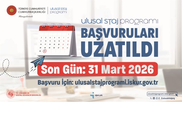 Cumhurbaşkanlığı Himayelerinde Türkiye İş Kurumu (İŞKUR) koordinasyonunda 2026 yılı “Ulusal Staj Programı” öğrenci başvuruları 06 Ocak 2026 tarihinde başlamış olup 31 Mart 2026 tarihi saat 23:59’a kadar devam edecektir.